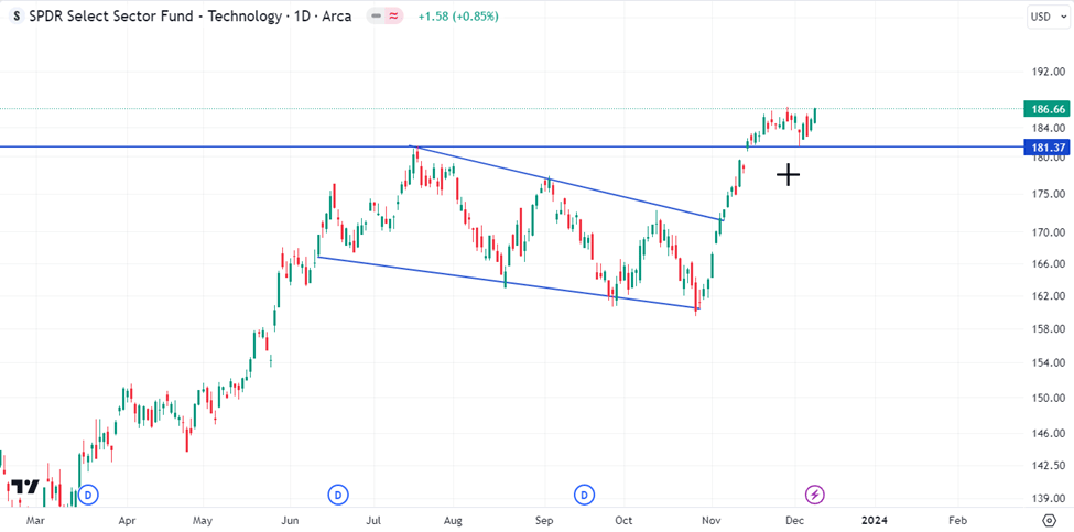 Last week, the Technology Select Sector SPDR ETF (XLK) closed at new highs. This is the most important sector in the entire market. It makes up 30% of the S&P 500, and 51% of the Nasdaq.