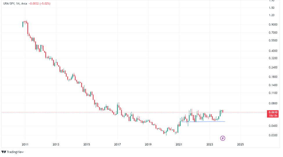 Here, we’re looking at the performance URA versus SPY. When this line was falling, it meant uranium stocks underperforming the S&P 500.