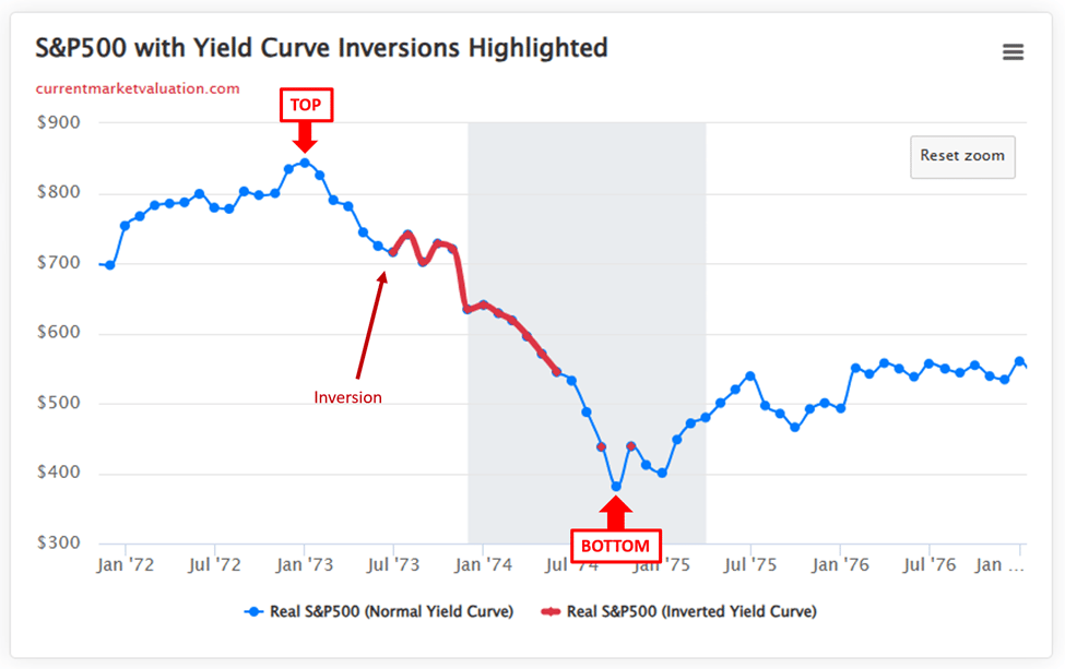 Nothing is perfect, and that goes for the inverted yield curve in June 1973. As you can see, the complete inversion was a bit late to tell investors something was wrong. But nonetheless, it told you.