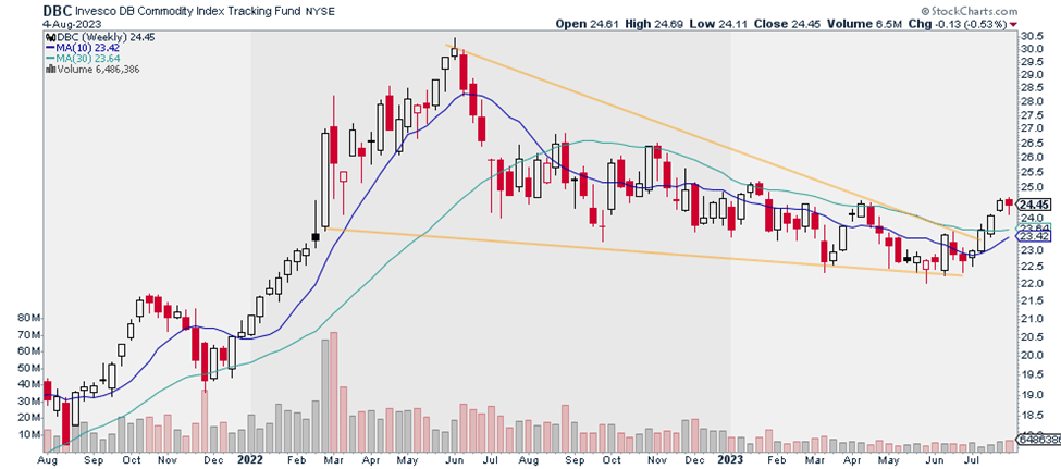 DBC had been in a downtrend since last June… until breaking out of that falling wedge pattern a few weeks ago.