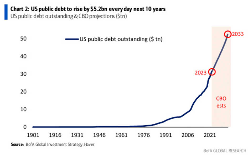 We can see that the total U.S. public debt outstanding is projected to rise from about $35 more than $50 trillion by 2033.